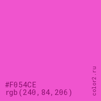 Цвет #F054CE в цветовой модели RGB обозначается тремя октетами (240, 84, 206) в десятичном формате и #F054CE в шестнадцатиричном (hex) формате, которые являются интенсивностью красного 240 (hex F0), интенсивность зелёного 84 (hex 54) и интенсивность синего 206 (hex CE).