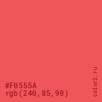 Цвет #F0555A в цветовой модели RGB обозначается тремя октетами (240, 85, 90) в десятичном формате и #F0555A в шестнадцатиричном (hex) формате, которые являются интенсивностью красного 240 (hex F0), интенсивность зелёного 85 (hex 55) и интенсивность синего 90 (hex 5A).