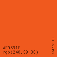 Цвет #F0591E в цветовой модели RGB обозначается тремя октетами (240, 89, 30) в десятичном формате и #F0591E в шестнадцатиричном (hex) формате, которые являются интенсивностью красного 240 (hex F0), интенсивность зелёного 89 (hex 59) и интенсивность синего 30 (hex 1E).