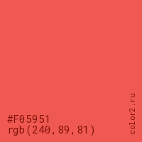 Цвет #F05951 в цветовой модели RGB обозначается тремя октетами (240, 89, 81) в десятичном формате и #F05951 в шестнадцатиричном (hex) формате, которые являются интенсивностью красного 240 (hex F0), интенсивность зелёного 89 (hex 59) и интенсивность синего 81 (hex 51).