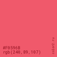 Цвет #F0596B в цветовой модели RGB обозначается тремя октетами (240, 89, 107) в десятичном формате и #F0596B в шестнадцатиричном (hex) формате, которые являются интенсивностью красного 240 (hex F0), интенсивность зелёного 89 (hex 59) и интенсивность синего 107 (hex 6B).