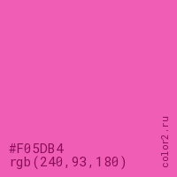 Цвет #F05DB4 в цветовой модели RGB обозначается тремя октетами (240, 93, 180) в десятичном формате и #F05DB4 в шестнадцатиричном (hex) формате, которые являются интенсивностью красного 240 (hex F0), интенсивность зелёного 93 (hex 5D) и интенсивность синего 180 (hex B4).