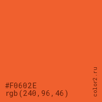 Цвет #F0602E в цветовой модели RGB обозначается тремя октетами (240, 96, 46) в десятичном формате и #F0602E в шестнадцатиричном (hex) формате, которые являются интенсивностью красного 240 (hex F0), интенсивность зелёного 96 (hex 60) и интенсивность синего 46 (hex 2E).