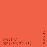 Цвет #F06147 в цветовой модели RGB обозначается тремя октетами (240, 97, 71) в десятичном формате и #F06147 в шестнадцатиричном (hex) формате, которые являются интенсивностью красного 240 (hex F0), интенсивность зелёного 97 (hex 61) и интенсивность синего 71 (hex 47).