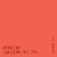 Цвет #F0614F в цветовой модели RGB обозначается тремя октетами (240, 97, 79) в десятичном формате и #F0614F в шестнадцатиричном (hex) формате, которые являются интенсивностью красного 240 (hex F0), интенсивность зелёного 97 (hex 61) и интенсивность синего 79 (hex 4F).