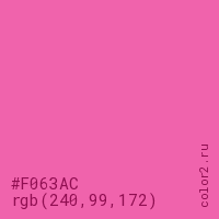 Цвет #F063AC в цветовой модели RGB обозначается тремя октетами (240, 99, 172) в десятичном формате и #F063AC в шестнадцатиричном (hex) формате, которые являются интенсивностью красного 240 (hex F0), интенсивность зелёного 99 (hex 63) и интенсивность синего 172 (hex AC).