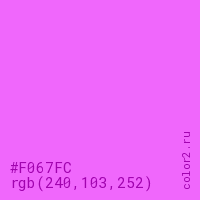 Цвет #F067FC в цветовой модели RGB обозначается тремя октетами (240, 103, 252) в десятичном формате и #F067FC в шестнадцатиричном (hex) формате, которые являются интенсивностью красного 240 (hex F0), интенсивность зелёного 103 (hex 67) и интенсивность синего 252 (hex FC).