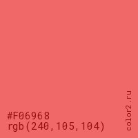 Цвет #F06968 в цветовой модели RGB обозначается тремя октетами (240, 105, 104) в десятичном формате и #F06968 в шестнадцатиричном (hex) формате, которые являются интенсивностью красного 240 (hex F0), интенсивность зелёного 105 (hex 69) и интенсивность синего 104 (hex 68).