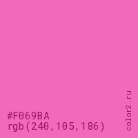 Цвет #F069BA в цветовой модели RGB обозначается тремя октетами (240, 105, 186) в десятичном формате и #F069BA в шестнадцатиричном (hex) формате, которые являются интенсивностью красного 240 (hex F0), интенсивность зелёного 105 (hex 69) и интенсивность синего 186 (hex BA).