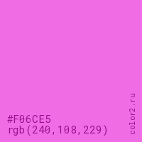 Цвет #F06CE5 в цветовой модели RGB обозначается тремя октетами (240, 108, 229) в десятичном формате и #F06CE5 в шестнадцатиричном (hex) формате, которые являются интенсивностью красного 240 (hex F0), интенсивность зелёного 108 (hex 6C) и интенсивность синего 229 (hex E5).