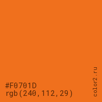 Цвет #F0701D в цветовой модели RGB обозначается тремя октетами (240, 112, 29) в десятичном формате и #F0701D в шестнадцатиричном (hex) формате, которые являются интенсивностью красного 240 (hex F0), интенсивность зелёного 112 (hex 70) и интенсивность синего 29 (hex 1D).