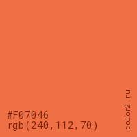 Цвет #F07046 в цветовой модели RGB обозначается тремя октетами (240, 112, 70) в десятичном формате и #F07046 в шестнадцатиричном (hex) формате, которые являются интенсивностью красного 240 (hex F0), интенсивность зелёного 112 (hex 70) и интенсивность синего 70 (hex 46).