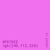 Цвет #F070EE в цветовой модели RGB обозначается тремя октетами (240, 112, 238) в десятичном формате и #F070EE в шестнадцатиричном (hex) формате, которые являются интенсивностью красного 240 (hex F0), интенсивность зелёного 112 (hex 70) и интенсивность синего 238 (hex EE).