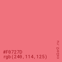 Цвет #F0727D в цветовой модели RGB обозначается тремя октетами (240, 114, 125) в десятичном формате и #F0727D в шестнадцатиричном (hex) формате, которые являются интенсивностью красного 240 (hex F0), интенсивность зелёного 114 (hex 72) и интенсивность синего 125 (hex 7D).