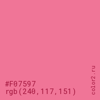 Цвет #F07597 в цветовой модели RGB обозначается тремя октетами (240, 117, 151) в десятичном формате и #F07597 в шестнадцатиричном (hex) формате, которые являются интенсивностью красного 240 (hex F0), интенсивность зелёного 117 (hex 75) и интенсивность синего 151 (hex 97).