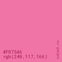 Цвет #F075A6 в цветовой модели RGB обозначается тремя октетами (240, 117, 166) в десятичном формате и #F075A6 в шестнадцатиричном (hex) формате, которые являются интенсивностью красного 240 (hex F0), интенсивность зелёного 117 (hex 75) и интенсивность синего 166 (hex A6).
