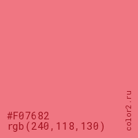 Цвет #F07682 в цветовой модели RGB обозначается тремя октетами (240, 118, 130) в десятичном формате и #F07682 в шестнадцатиричном (hex) формате, которые являются интенсивностью красного 240 (hex F0), интенсивность зелёного 118 (hex 76) и интенсивность синего 130 (hex 82).