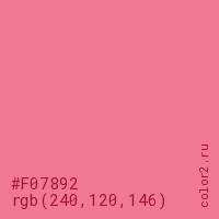 Цвет #F07892 в цветовой модели RGB обозначается тремя октетами (240, 120, 146) в десятичном формате и #F07892 в шестнадцатиричном (hex) формате, которые являются интенсивностью красного 240 (hex F0), интенсивность зелёного 120 (hex 78) и интенсивность синего 146 (hex 92).
