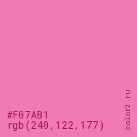 Цвет #F07AB1 в цветовой модели RGB обозначается тремя октетами (240, 122, 177) в десятичном формате и #F07AB1 в шестнадцатиричном (hex) формате, которые являются интенсивностью красного 240 (hex F0), интенсивность зелёного 122 (hex 7A) и интенсивность синего 177 (hex B1).