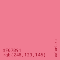 Цвет #F07B91 в цветовой модели RGB обозначается тремя октетами (240, 123, 145) в десятичном формате и #F07B91 в шестнадцатиричном (hex) формате, которые являются интенсивностью красного 240 (hex F0), интенсивность зелёного 123 (hex 7B) и интенсивность синего 145 (hex 91).