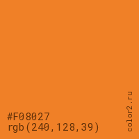 Цвет #F08027 в цветовой модели RGB обозначается тремя октетами (240, 128, 39) в десятичном формате и #F08027 в шестнадцатиричном (hex) формате, которые являются интенсивностью красного 240 (hex F0), интенсивность зелёного 128 (hex 80) и интенсивность синего 39 (hex 27).