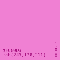 Цвет #F080D3 в цветовой модели RGB обозначается тремя октетами (240, 128, 211) в десятичном формате и #F080D3 в шестнадцатиричном (hex) формате, которые являются интенсивностью красного 240 (hex F0), интенсивность зелёного 128 (hex 80) и интенсивность синего 211 (hex D3).