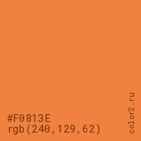 Цвет #F0813E в цветовой модели RGB обозначается тремя октетами (240, 129, 62) в десятичном формате и #F0813E в шестнадцатиричном (hex) формате, которые являются интенсивностью красного 240 (hex F0), интенсивность зелёного 129 (hex 81) и интенсивность синего 62 (hex 3E).