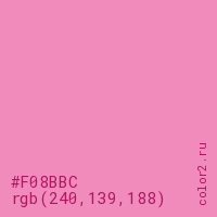 Цвет #F08BBC в цветовой модели RGB обозначается тремя октетами (240, 139, 188) в десятичном формате и #F08BBC в шестнадцатиричном (hex) формате, которые являются интенсивностью красного 240 (hex F0), интенсивность зелёного 139 (hex 8B) и интенсивность синего 188 (hex BC).