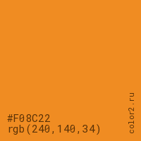 Цвет #F08C22 в цветовой модели RGB обозначается тремя октетами (240, 140, 34) в десятичном формате и #F08C22 в шестнадцатиричном (hex) формате, которые являются интенсивностью красного 240 (hex F0), интенсивность зелёного 140 (hex 8C) и интенсивность синего 34 (hex 22).