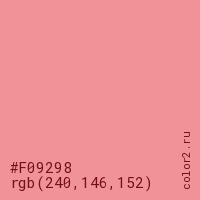 Цвет #F09298 в цветовой модели RGB обозначается тремя октетами (240, 146, 152) в десятичном формате и #F09298 в шестнадцатиричном (hex) формате, которые являются интенсивностью красного 240 (hex F0), интенсивность зелёного 146 (hex 92) и интенсивность синего 152 (hex 98).