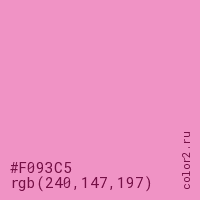 Цвет #F093C5 в цветовой модели RGB обозначается тремя октетами (240, 147, 197) в десятичном формате и #F093C5 в шестнадцатиричном (hex) формате, которые являются интенсивностью красного 240 (hex F0), интенсивность зелёного 147 (hex 93) и интенсивность синего 197 (hex C5).