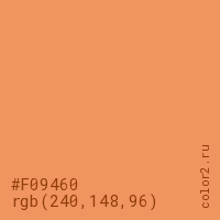 Цвет #F09460 в цветовой модели RGB обозначается тремя октетами (240, 148, 96) в десятичном формате и #F09460 в шестнадцатиричном (hex) формате, которые являются интенсивностью красного 240 (hex F0), интенсивность зелёного 148 (hex 94) и интенсивность синего 96 (hex 60).