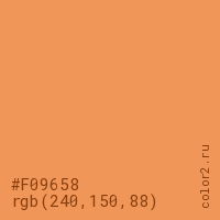 Цвет #F09658 в цветовой модели RGB обозначается тремя октетами (240, 150, 88) в десятичном формате и #F09658 в шестнадцатиричном (hex) формате, которые являются интенсивностью красного 240 (hex F0), интенсивность зелёного 150 (hex 96) и интенсивность синего 88 (hex 58).