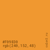 Цвет #F09830 в цветовой модели RGB обозначается тремя октетами (240, 152, 48) в десятичном формате и #F09830 в шестнадцатиричном (hex) формате, которые являются интенсивностью красного 240 (hex F0), интенсивность зелёного 152 (hex 98) и интенсивность синего 48 (hex 30).