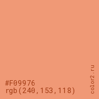 Цвет #F09976 в цветовой модели RGB обозначается тремя октетами (240, 153, 118) в десятичном формате и #F09976 в шестнадцатиричном (hex) формате, которые являются интенсивностью красного 240 (hex F0), интенсивность зелёного 153 (hex 99) и интенсивность синего 118 (hex 76).