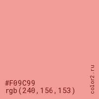 Цвет #F09C99 в цветовой модели RGB обозначается тремя октетами (240, 156, 153) в десятичном формате и #F09C99 в шестнадцатиричном (hex) формате, которые являются интенсивностью красного 240 (hex F0), интенсивность зелёного 156 (hex 9C) и интенсивность синего 153 (hex 99).