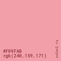 Цвет #F09FAB в цветовой модели RGB обозначается тремя октетами (240, 159, 171) в десятичном формате и #F09FAB в шестнадцатиричном (hex) формате, которые являются интенсивностью красного 240 (hex F0), интенсивность зелёного 159 (hex 9F) и интенсивность синего 171 (hex AB).