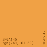 Цвет #F0A145 в цветовой модели RGB обозначается тремя октетами (240, 161, 69) в десятичном формате и #F0A145 в шестнадцатиричном (hex) формате, которые являются интенсивностью красного 240 (hex F0), интенсивность зелёного 161 (hex A1) и интенсивность синего 69 (hex 45).