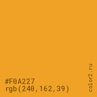 Цвет #F0A227 в цветовой модели RGB обозначается тремя октетами (240, 162, 39) в десятичном формате и #F0A227 в шестнадцатиричном (hex) формате, которые являются интенсивностью красного 240 (hex F0), интенсивность зелёного 162 (hex A2) и интенсивность синего 39 (hex 27).