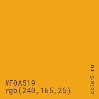 Цвет #F0A519 в цветовой модели RGB обозначается тремя октетами (240, 165, 25) в десятичном формате и #F0A519 в шестнадцатиричном (hex) формате, которые являются интенсивностью красного 240 (hex F0), интенсивность зелёного 165 (hex A5) и интенсивность синего 25 (hex 19).