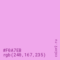 Цвет #F0A7EB в цветовой модели RGB обозначается тремя октетами (240, 167, 235) в десятичном формате и #F0A7EB в шестнадцатиричном (hex) формате, которые являются интенсивностью красного 240 (hex F0), интенсивность зелёного 167 (hex A7) и интенсивность синего 235 (hex EB).