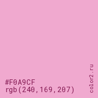 Цвет #F0A9CF в цветовой модели RGB обозначается тремя октетами (240, 169, 207) в десятичном формате и #F0A9CF в шестнадцатиричном (hex) формате, которые являются интенсивностью красного 240 (hex F0), интенсивность зелёного 169 (hex A9) и интенсивность синего 207 (hex CF).