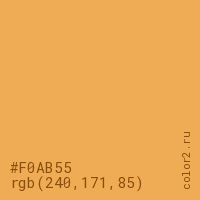 Цвет #F0AB55 в цветовой модели RGB обозначается тремя октетами (240, 171, 85) в десятичном формате и #F0AB55 в шестнадцатиричном (hex) формате, которые являются интенсивностью красного 240 (hex F0), интенсивность зелёного 171 (hex AB) и интенсивность синего 85 (hex 55).