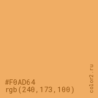 Цвет #F0AD64 в цветовой модели RGB обозначается тремя октетами (240, 173, 100) в десятичном формате и #F0AD64 в шестнадцатиричном (hex) формате, которые являются интенсивностью красного 240 (hex F0), интенсивность зелёного 173 (hex AD) и интенсивность синего 100 (hex 64).