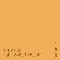 Цвет #F0AF58 в цветовой модели RGB обозначается тремя октетами (240, 175, 88) в десятичном формате и #F0AF58 в шестнадцатиричном (hex) формате, которые являются интенсивностью красного 240 (hex F0), интенсивность зелёного 175 (hex AF) и интенсивность синего 88 (hex 58).