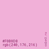 Цвет #F0B0D8 в цветовой модели RGB обозначается тремя октетами (240, 176, 216) в десятичном формате и #F0B0D8 в шестнадцатиричном (hex) формате, которые являются интенсивностью красного 240 (hex F0), интенсивность зелёного 176 (hex B0) и интенсивность синего 216 (hex D8).