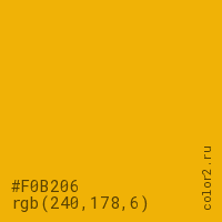 Цвет #F0B206 в цветовой модели RGB обозначается тремя октетами (240, 178, 6) в десятичном формате и #F0B206 в шестнадцатиричном (hex) формате, которые являются интенсивностью красного 240 (hex F0), интенсивность зелёного 178 (hex B2) и интенсивность синего 6 (hex 06).