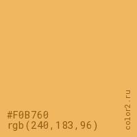 Цвет #F0B760 в цветовой модели RGB обозначается тремя октетами (240, 183, 96) в десятичном формате и #F0B760 в шестнадцатиричном (hex) формате, которые являются интенсивностью красного 240 (hex F0), интенсивность зелёного 183 (hex B7) и интенсивность синего 96 (hex 60).