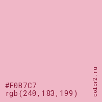 Цвет #F0B7C7 в цветовой модели RGB обозначается тремя октетами (240, 183, 199) в десятичном формате и #F0B7C7 в шестнадцатиричном (hex) формате, которые являются интенсивностью красного 240 (hex F0), интенсивность зелёного 183 (hex B7) и интенсивность синего 199 (hex C7).