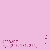 Цвет #F0BADE в цветовой модели RGB обозначается тремя октетами (240, 186, 222) в десятичном формате и #F0BADE в шестнадцатиричном (hex) формате, которые являются интенсивностью красного 240 (hex F0), интенсивность зелёного 186 (hex BA) и интенсивность синего 222 (hex DE).